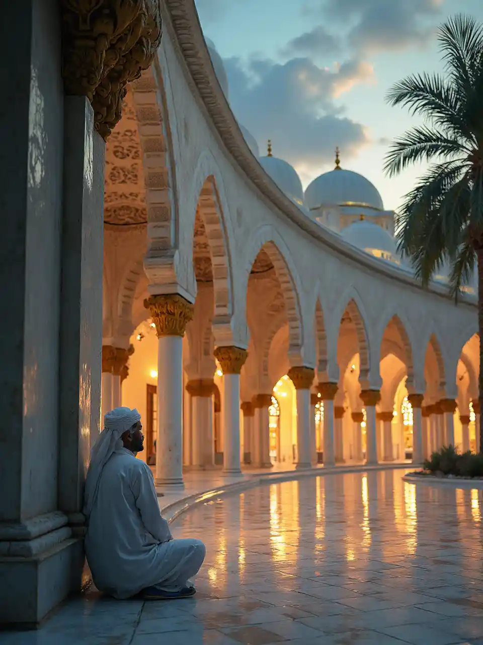Seorang pria Muslim Arab berpakaian putih duduk di sudut kiri gambar membelakangi lensa, di depan pria itu masjid yang indah dengan langit yang sejuk, gerimis sejuk, angin sejuk yang berlarian, sangat tenang, masjid yang indah dengan kuburan dan mihrab, lengkungan dengan kisi-kisi Islam yang rumit, koridor lengkungan, pepohonan, halaman masjid, masjid di dalam diterangi oleh cahaya emas yang memantulkan cahaya melalui kisi-kisi mihrab,