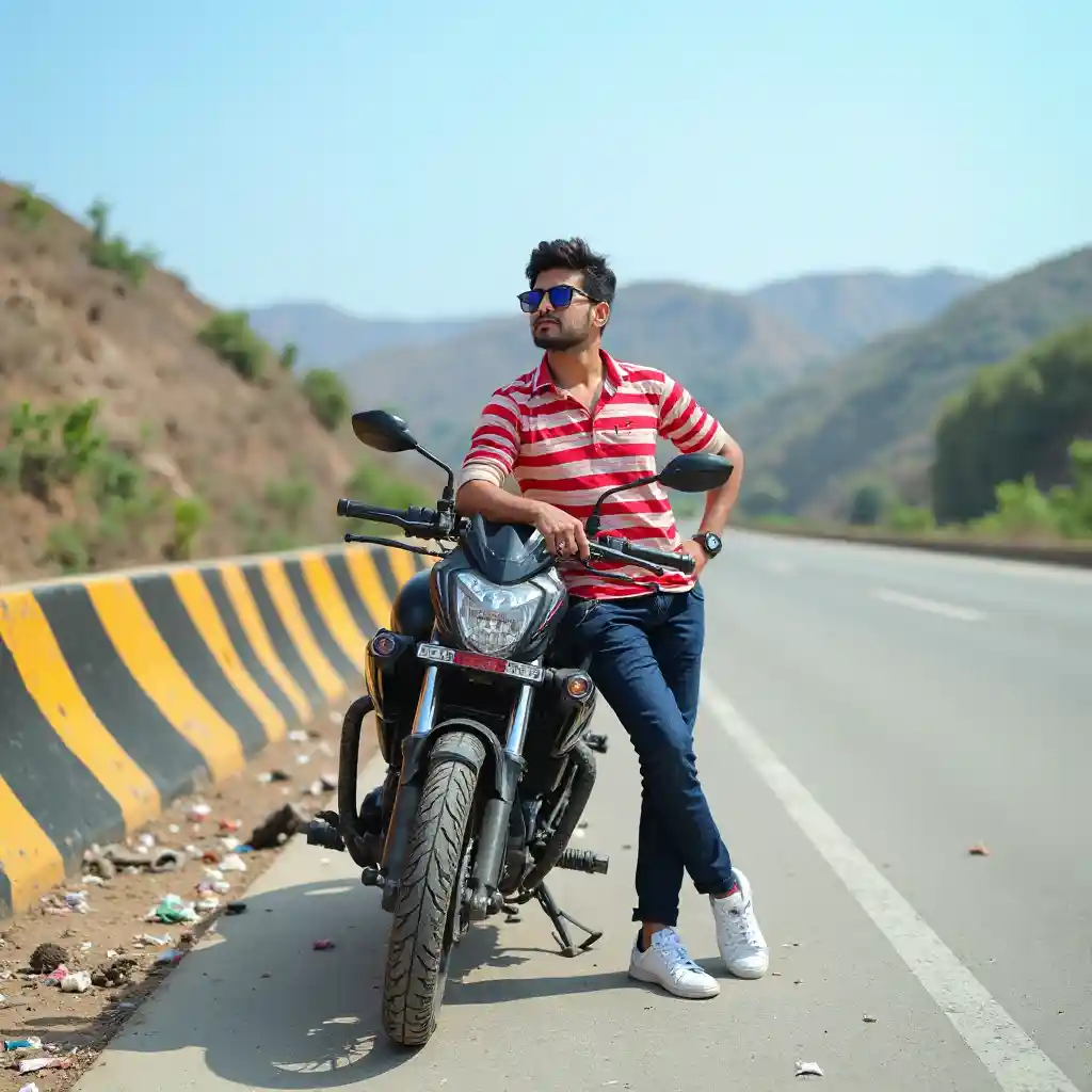 Seorang pria muda dengan santai bersandar pada sepeda motor yang mulus di tepi jalan yang bermandikan sinar matahari, mengenakan kemeja bergaris merah-putih yang dinamis, kontras dengan celana jins gelapnya dan sepatu kets putih yang sporty. Kacamata hitamnya memantulkan langit biru yang cerah, dan dia memancarkan sikap percaya diri saat dia sedikit menjauh dari kamera dengan ekspresi termenung. Jalan beton dikelilingi oleh penghalang keamanan yang dicat dengan garis-garis kuning dan hitam yang berani, mengarah ke lanskap perbukitan hijau yang dihiasi di latar belakang. Dengan latar belakang langit yang tidak berawan, bukit-bukit yang bergulir dapat dilihat, menyiratkan bahwa hari yang hangat dan cerah adalah tempat yang ideal untuk mengendarai sepeda motor yang indah, sementara puing-puing yang tersebar di sepanjang jalan menyiratkan lingkungan yang kurang bersih. Adegan ini menangkap momen petualangan dan masa muda dengan latar belakang alam yang indah.