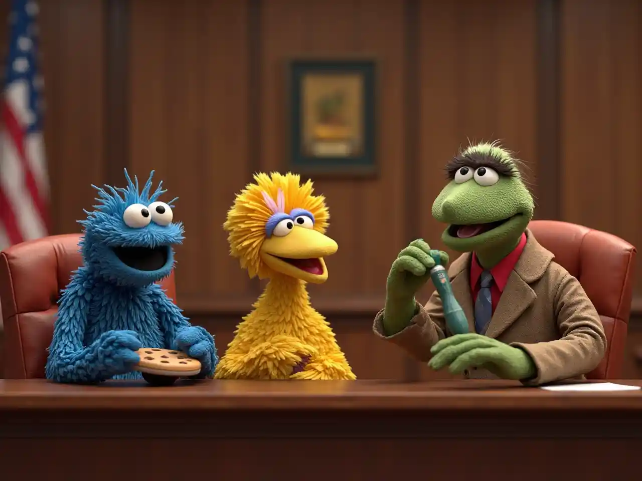 Cookie Monster, Big Bird, Oscar the Grouch, Grover di pengadilan dengan hakim, 3D rendering