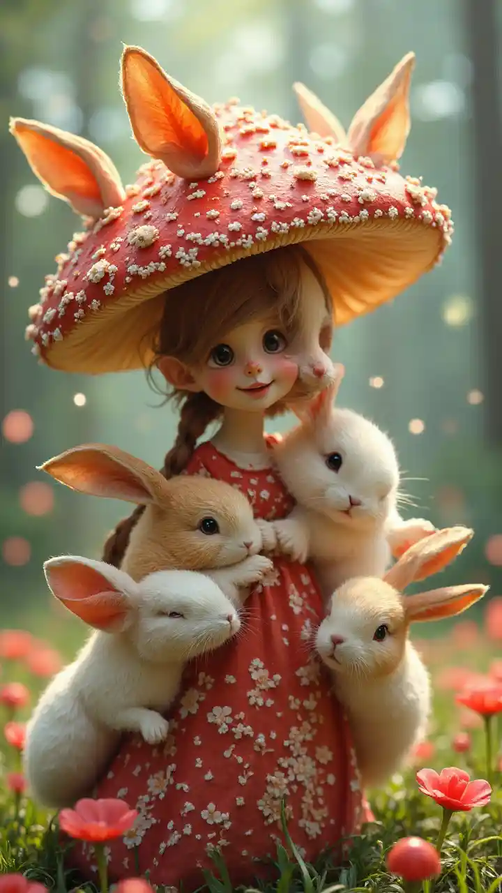 Queen of Mushroom, Ada kelinci dan burung, Warna cerah dan berkilau, High quality light base, Vogue photography style, Kualitas 8k