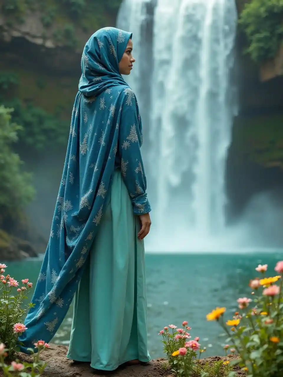 Gambar yang luas sangat indah Muslimah bermata biru Jilbab biru bermotif pohon, celana panjang berwarna hijau muda, berdiri di sisi air terjun besar yang indah, melihat senja yang jatuh dengan bunga dan pepohonan di sekitarnya