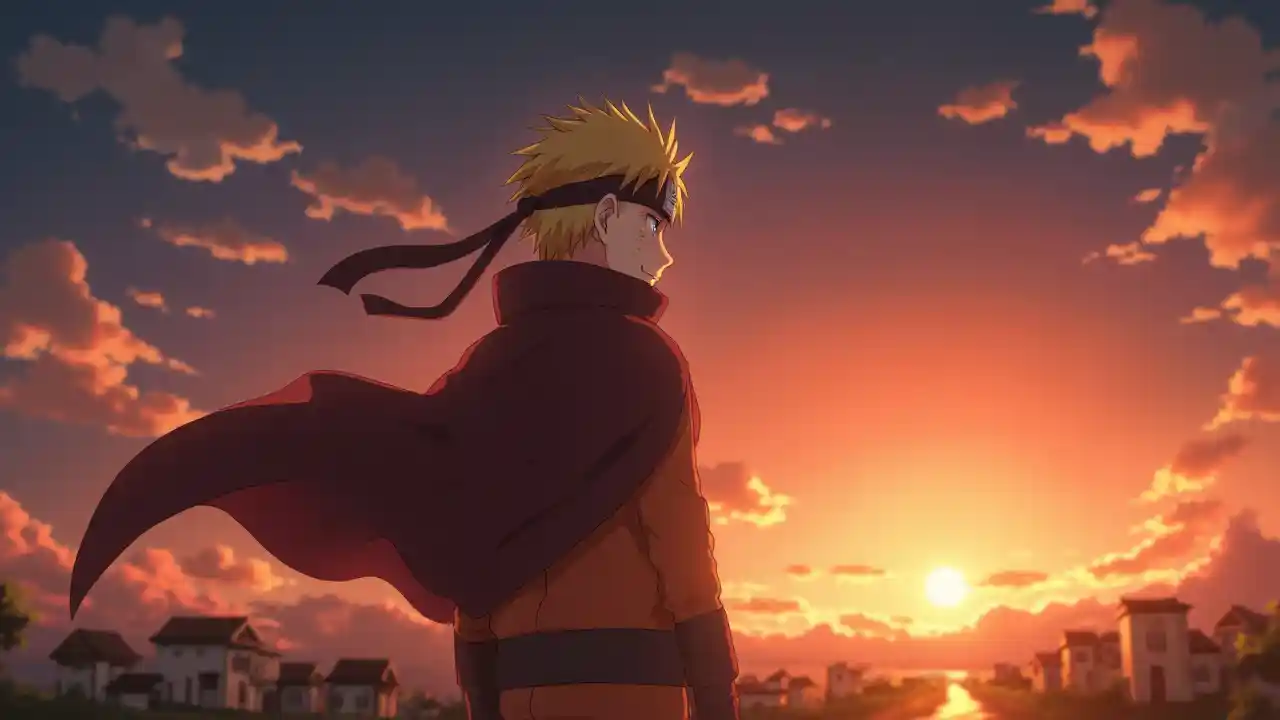 Buat video bergaya anime 4K (2160x3840) vertikal, Uzumaki Naruto – Berdiri di desa daun tersembunyi matahari terbenam, angin meniup jubahnya, ekspresi tegas. Gaya: Animasi sinematik, detail tinggi, pencahayaan dramatis, gerakan slow motion. Format: Vertikal (9:16), Resolusi: 4K (2160x3840).