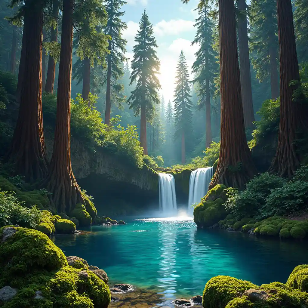 Hutan Redwood yang megah dengan air terjun dan danau yang tenang