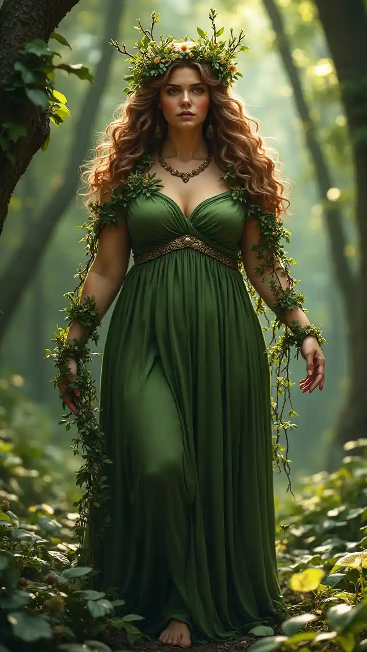 Pohon abu - nimfa wanita - gemuk - rambut keriting coklat panjang - memakai cabang dan mahkota daun - dia adalah bagian dari pohon - dia memiliki kulit dan cabang dan daun pada kulitnya - dia memiliki bagian alami pada pakaiannya - dia memiliki gaun flowy gaya Yunani dengan panjang lantai, Terbuat dari daun, kulit kayu dan bunga - kulit kayu adalah bagian dari kulitnya - dia adalah wanita ukuran plus dengan tubuh penuh - wanita dengan kulit kencang India - dia adalah wanita dewasa - dia berada di hutan yang penuh dengan cahaya, hijau, Dan bunga – dia memakai cabang dan ranting besar, mahkota daun – daun melilit lengannya – tumbuh dari tanah – daun melilit rambutnya
