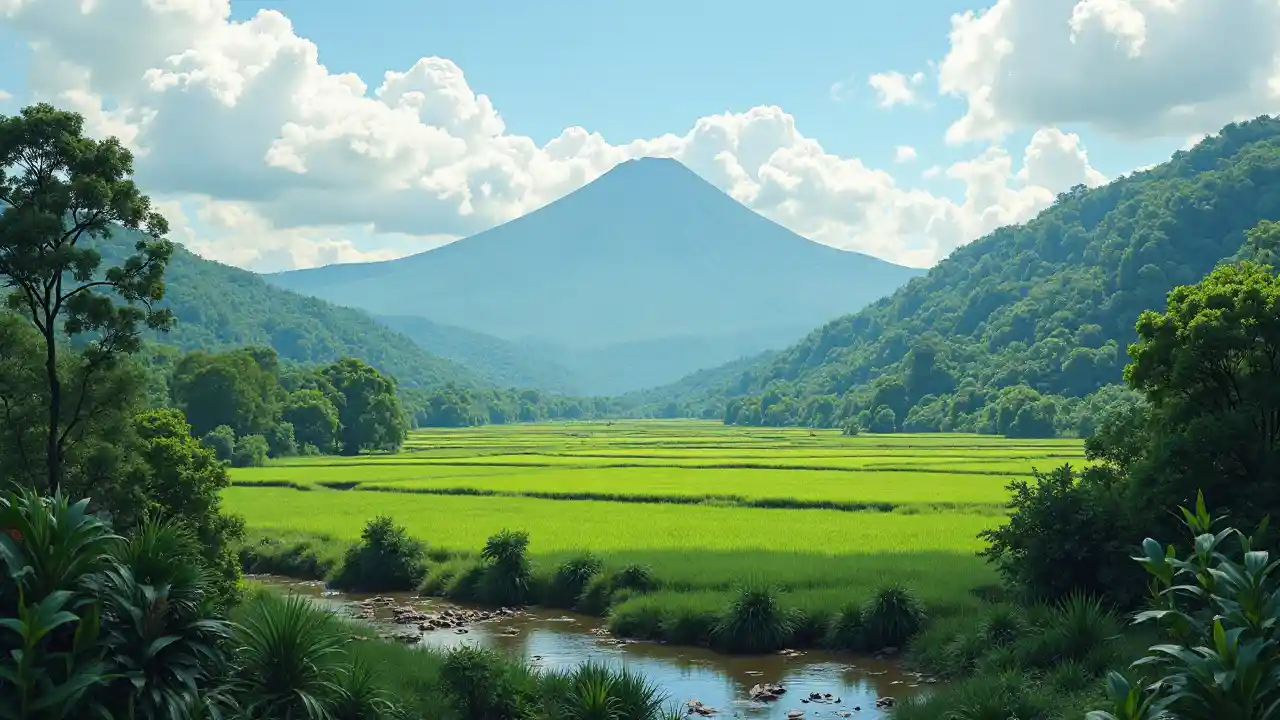 Cooperbuat gambar pemandangan dengan gunung,sawah,sungai dan pohon-pohon
