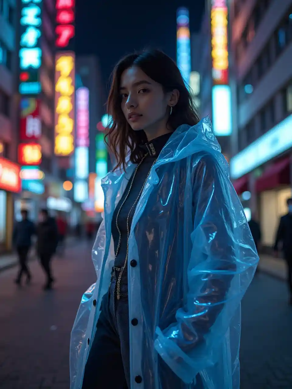 Wanita bermantel tembus pandang, berdiri di jalan, neon net city, malam, papan nama neon