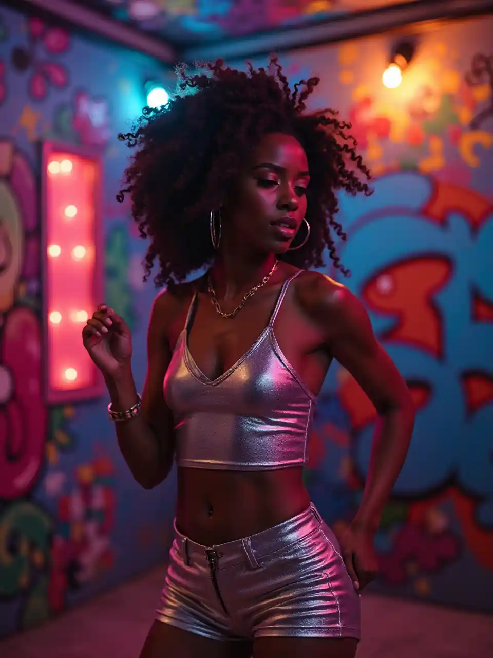 Seorang wanita kulit hitam berusia 25 tahun yang mencolok menari di bawah lampu neon di sebuah klub bawah tanah yang semarak dengan atasan crop metalik dan celana pendek berpinggang tinggi yang menyoroti gerakannya yang berirama dengan dinding grafiti berwarna-warni di latar belakang.