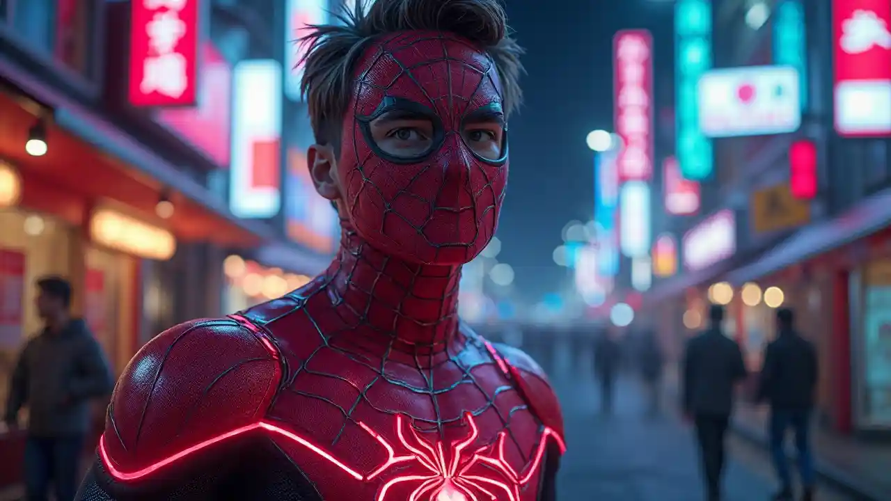 Buat gambar 8k yang sangat detail dan realistis dalam kostum Spider-Man untuk Zac Efron. Latar belakang seharusnya berada di jalanan Tokyo, lengkap dengan lampu neon. Dia harus memakai neon dengan lampu spiderman horoskop