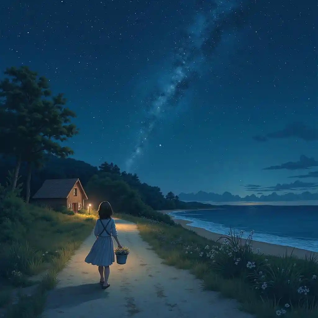 Seorang gadis berjalan di jalan dengan seember bunga di tengah malam. Satu mil jauhnya ada rumah yang dikelilingi pepohonan. Di sisi lain ada pantai dengan bintang-bintang memantulkan air.