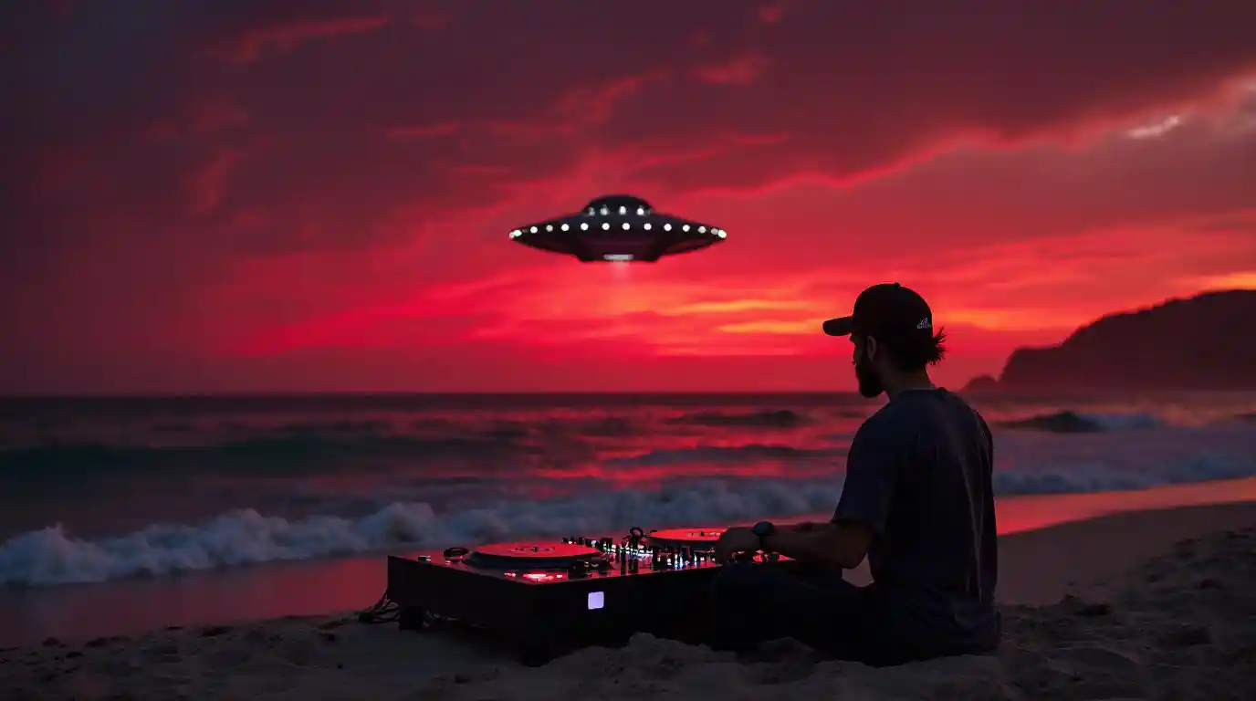 black ufo with lights flying in red sky by night and wave sea in cabo negro and dj with cap playing in sand with two turntables