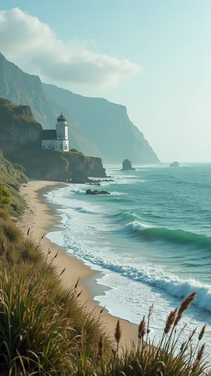 Ini harus menjadi estetika dari sampul buku misteri. Laut dan di sebelahnya adalah hamparan pasir dengan lamun yang tumbuh tinggi. Di kejauhan di pantai adalah sebuah gereja berbingkai putih dengan mercusuar putih di sebelahnya. Tepat di luar gedung di kejauhan, ada tebing yang jatuh ke laut