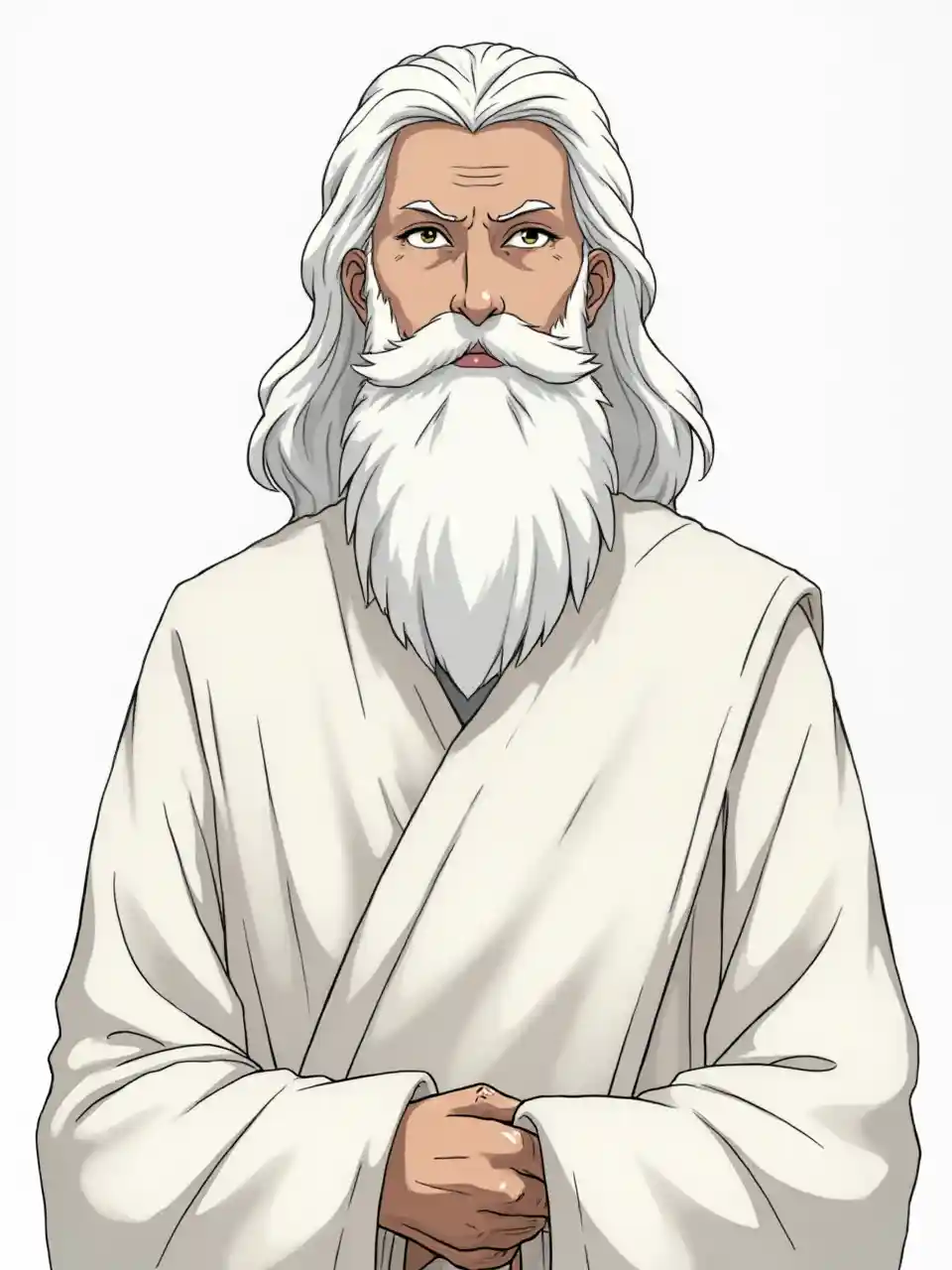 Langsung ke penonton, potret tubuh bagian atas yang sangat rinci dari seorang dewa berjanggut putih tua, mengenakan jubah Alkitab kosong putih. Latar belakang monokrom sederhana. Dalam gaya seni anime Pokémon. Siluet hitam.
