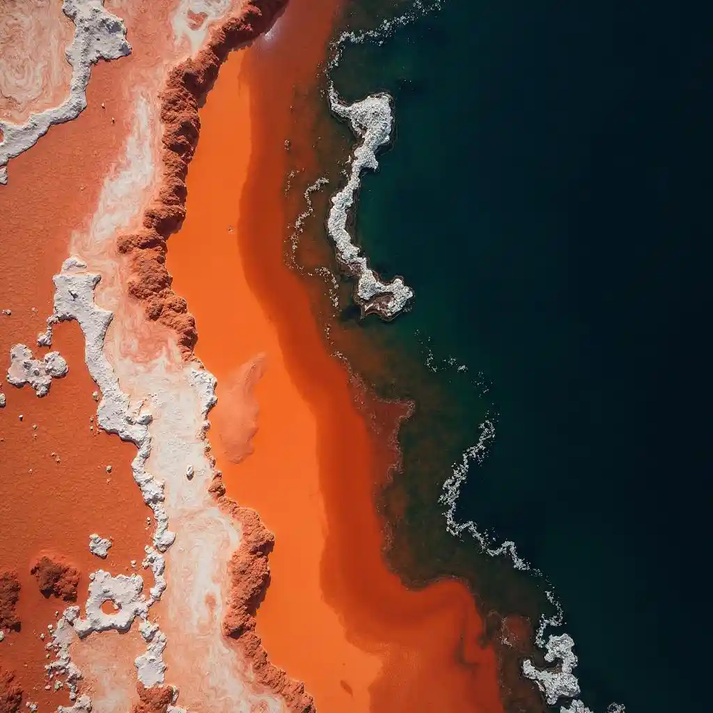 Dari pemandangan udara garis pantai di ketinggian yang sangat tinggi, daratan oranye yang cerah bertemu dengan badan air yang dalam dan gelap. Garis pantai tidak teratur dan bersemangat, dengan warna oranye dan kemerahan yang kontras dengan air laut yang gelap dan hampir hitam. Tanah terlihat bertekstur dan beberapa area berwarna putih, menyiratkan dataran garam atau tanah kering yang retak. Transisi antara tanah dan air sangat mencolok, dengan rona oranye menghilang secara dramatis ke dalam air yang gelap, dan bintik-bintik kecil busa putih atau gelembung terlihat di dekat pantai. Pemandangan holistik terasa surealis dan hampir dunia lain