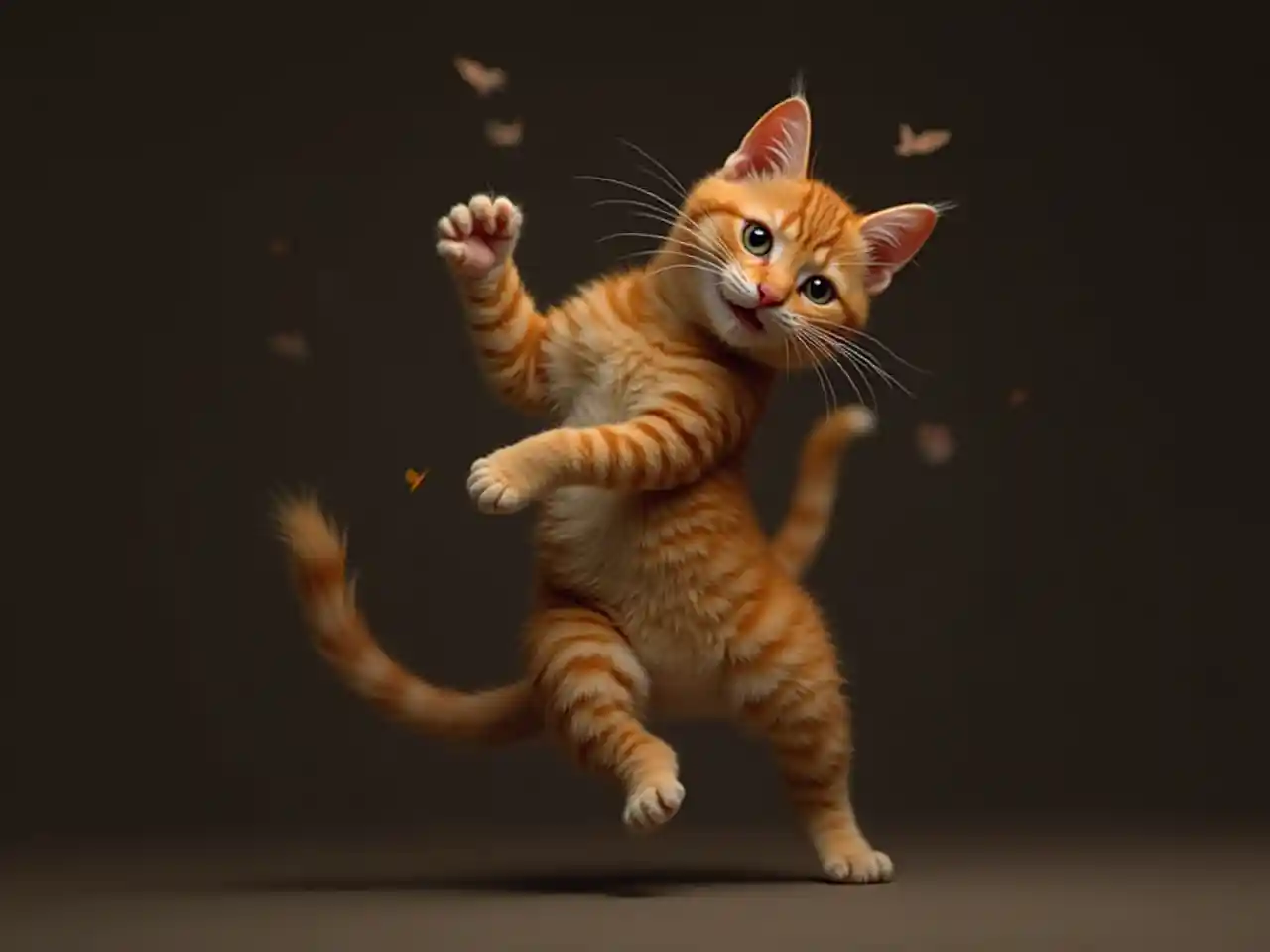 Meningkatkan tarian kucing tabby oranye dengan latar belakang gelap