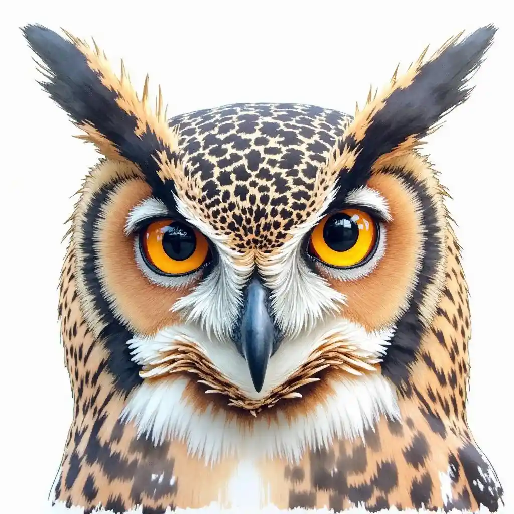 Up close portrait of a great horned owl staring straight at the camera; in transparent watercolor medium; in very expressionistic and splashy style.