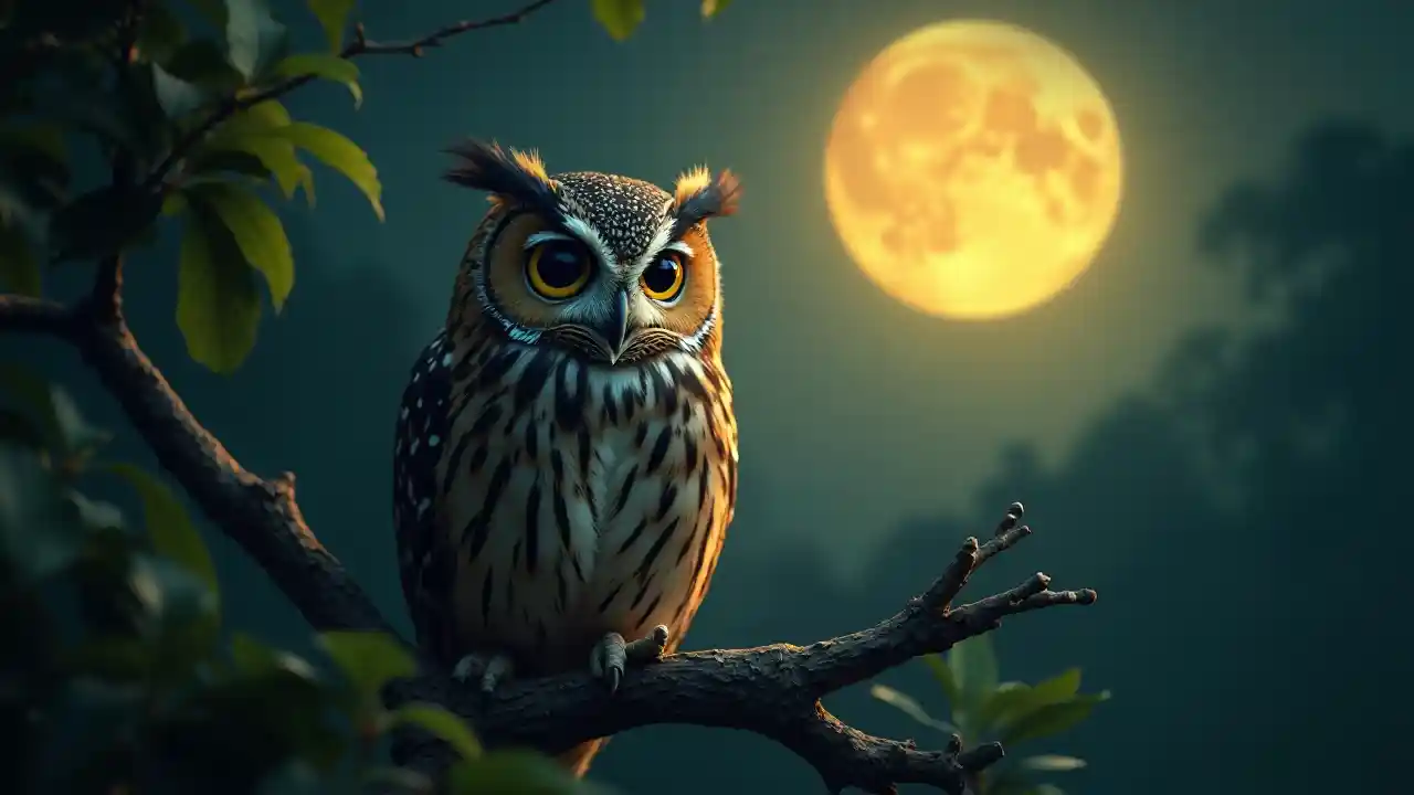 Pemandangan malam yang menawan dengan burung hantu dan bulan purnama