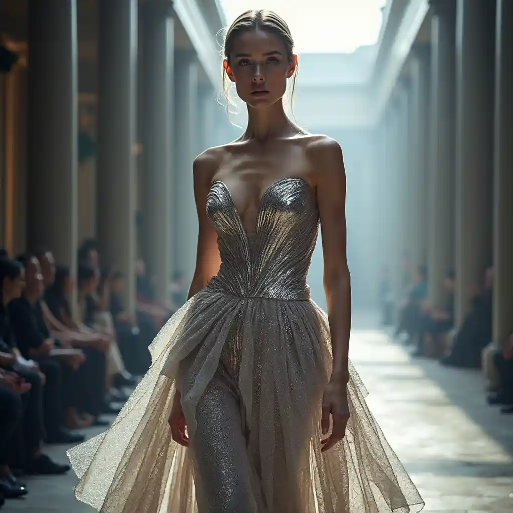 Gaun Paco Rabanne, tekstur logam yang menakjubkan, desain elegan futuristik, detail rumit yang berkedip di bawah cahaya, cahaya atmosfer yang lembut, pernyataan mode yang chic dan inovatif, gaya runway haute couture, siluet elegan, komposisi yang cerdik, detail super, pengerjaan mewah, latar belakang arsitektur modern yang menawan, suasana mewah, resolusi 4K.