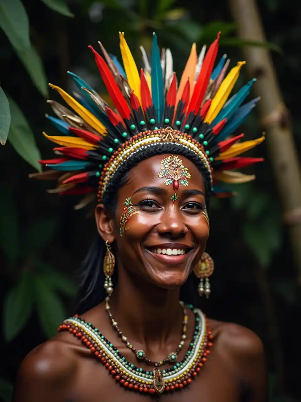 MackenziePapua New Guinea Lady Smile, Tiara, Bulu multiwarna yang cerah, Coklat coklat Latar belakang daun gelap, Tropis, Cahaya dramatis, Warna pelangi yang semarak, Cat wajah Tribal