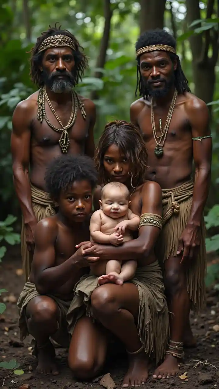 GraceEmpat ayah suku New Guinea mengenakan pakaian hutan otentik sambil menggendong bayi Kaukasia putih yang baru lahir