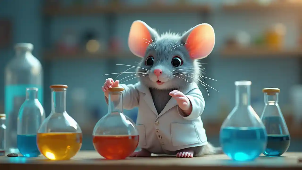 Rendering 3D dari tikus peliharaan berbulu lucu yang mencampur tabung reaksi kimia di laboratorium kimia dengan jas lab putih, bokeh, Canon 50mm, pencahayaan film, cahaya volume, oktan, rendering oktan, rendering pergeseran merah