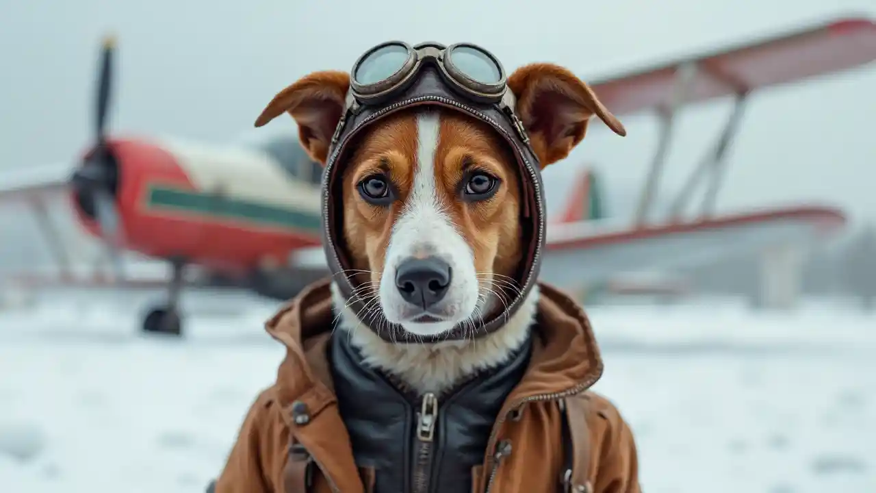 SophiaPotret realistis anjing Jack Russell dengan kostum pilot, realistis, salah satu pesawat di latar belakang, salju