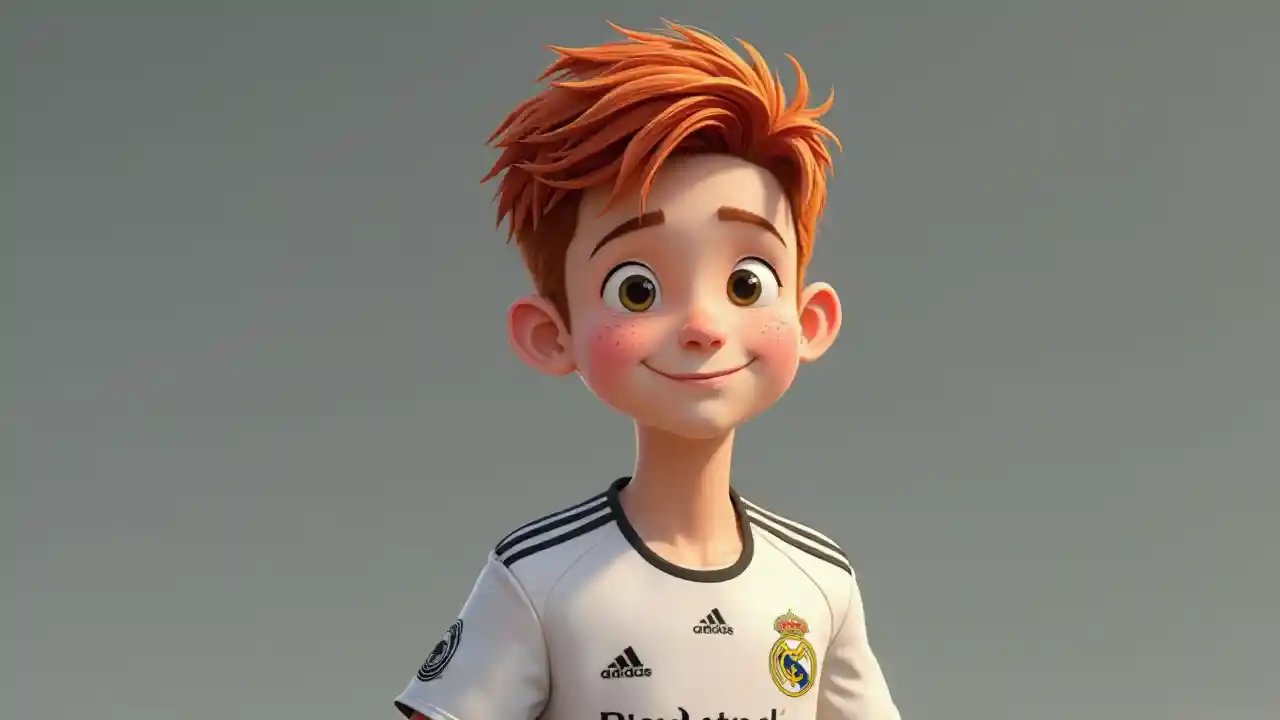 Jeremy de León sebagai seorang anak, rambut kemerahan, kulit putih, bintik-bintik di wajahnya, bermain dengan warna putih dan hitam yang digunakan oleh tim Real Madrid Castilla, toon, seluruh tubuh, karakter piksel, potret, latar belakang yang solid