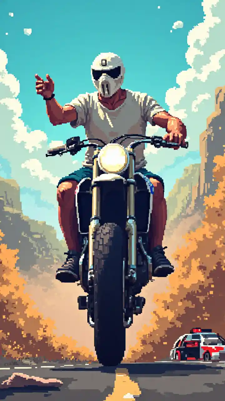 Pixel Art, sebuah lanskap dinamis yang hidup, seorang pemuda bertopi balaclava putih, berdandan santai dengan kaos oblong dan celana pendek, aktif menunggangi motor trail Yamaha yang apik, mengacungkan jari tengah, dikejar mobil polisi, dan juga mengabadikan momen mendebarkan saat melakukan bike. Warna-warna cerah menekankan stimulasi, dan detail pixelated membentuk suasana yang hidup dan energik, dengan latar belakang gradien yang lembut sebagai latar belakang, meningkatkan aksi dalam kualitas pedesaan.
