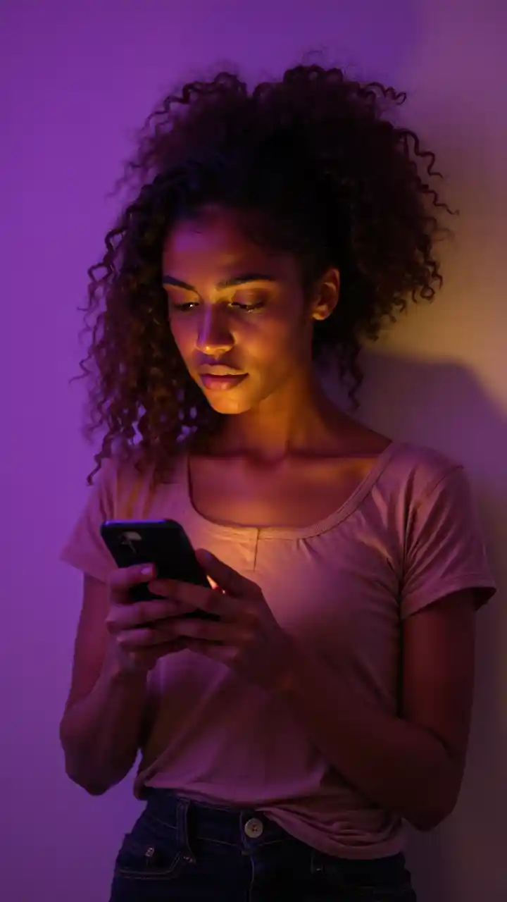 Gadis kulit hitam dengan warna dasar ungu, refleksi cahaya kuning di wajahnya, rambut coklat putihnya menggunakan ponsel