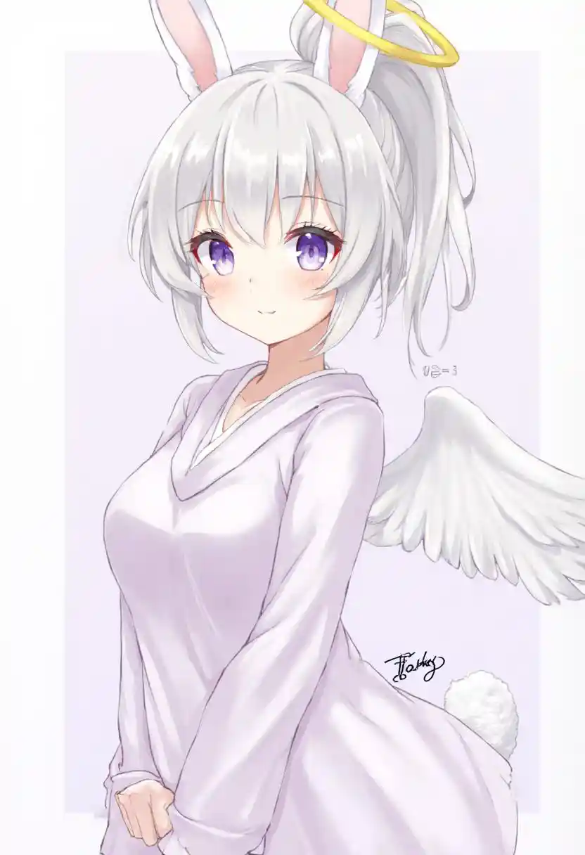 Penelope1girl, (furry, kemono: 1.4), gadis kelinci, hidung binatang, telinga kelinci, mata ungu, malaikat, cincin malaikat, sayap, sayap malaikat littele, ekor kuda, perona pipi, rambut beruban, ungu