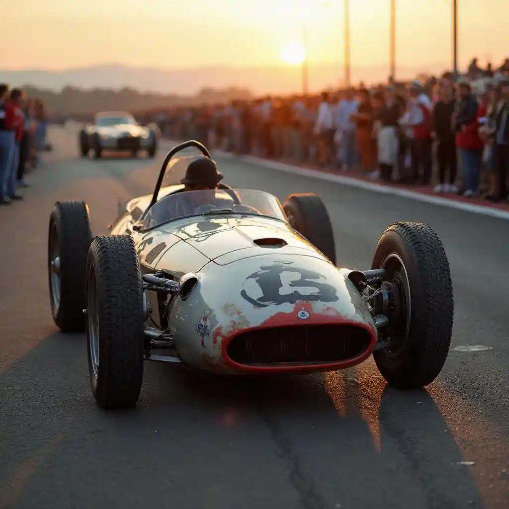 Sebuah mobil balap vintage duduk dengan bangga di trek, garis-garis halus dan cat usang menceritakan kisah kemenangan masa lalu, kerumunan di sekitarnya bersorak di wajah yang diterangi oleh cahaya hangat matahari terbenam, logam tua mobil