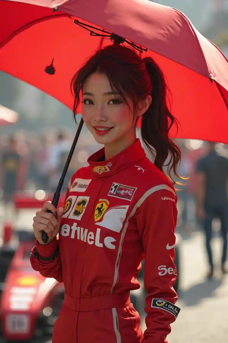 JackLevi, wanita dengan ekor kuda, race queen, payung besar, mobil Formula 1 merah (1:1), sedang tersenyum, loop, ergonomis tubuh yang benar melihat wajah