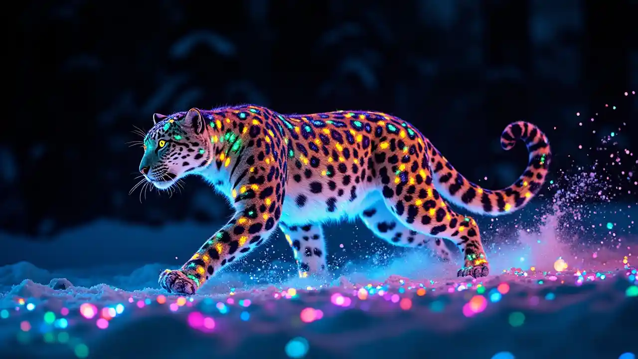 Leopard salju pelangi yang hidup di salju bioluminescent