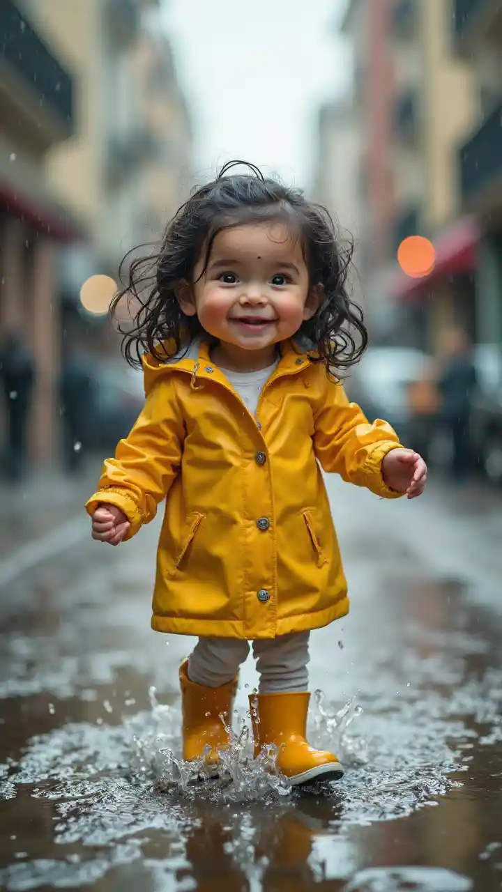 Bayangkan seorang gadis kecil berambut hitam, mengenakan jas hujan kuning dan sepatu bot, memercikkan genangan air di jalan-jalan kota. Hujan turun dengan lembut di sampingnya, dan ekspresi kegembiraannya mencerminkan kecintaannya pada petualangan di hari hujan.