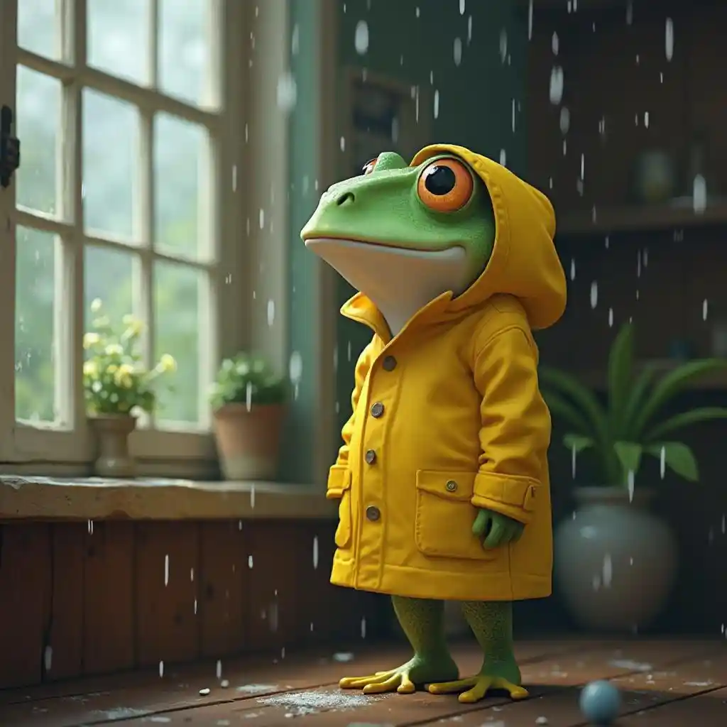 Aku ingin katak tampan, terlihat lucu dan pintar, dia memakai jas hujan kuning, dia berdiri di rumah. Kami hanya melihat sisi wajahnya, ada jendela di sebelah kirinya, jendela di tengah layar. Di luar hujan