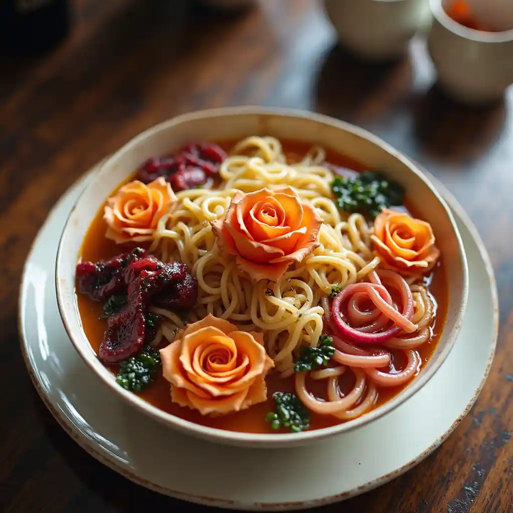 CamilaSemangkuk ramen dicampur dengan bunga mawar.