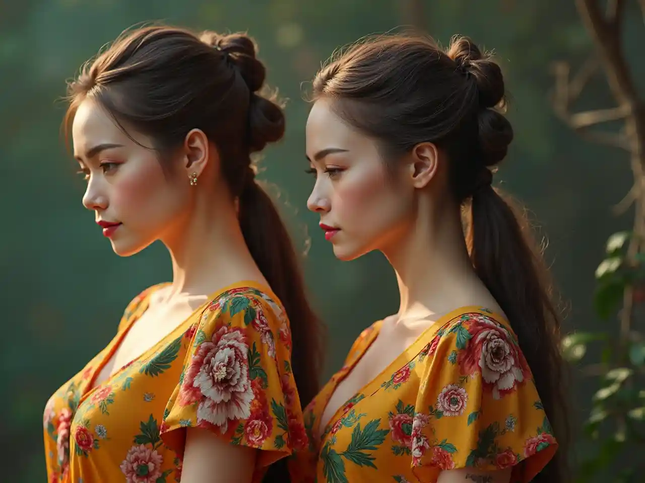 WyattFoto setengah badan dua perempuan dengan pakain seperti ratu bunga, pria memiliki rambut sedikit keriting, epik detail, realistis, ray tracing, realistis, foto manusia realistis, super realistis, mahakarya