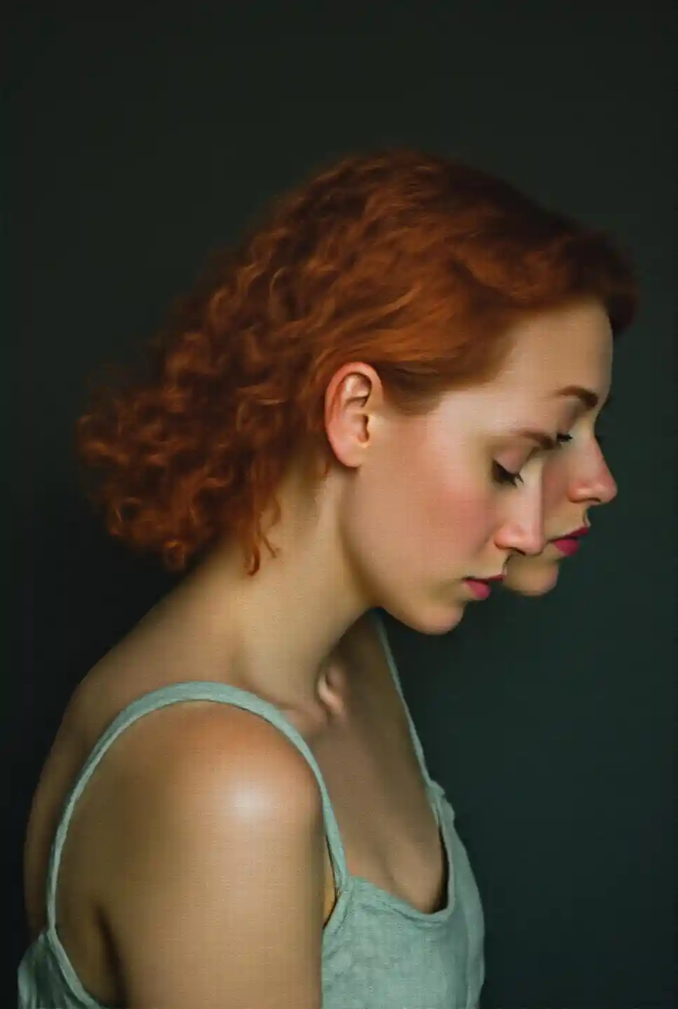 graceLuminescent Multiple Exposure Portrait Capture Wanita Berambut Merah Memutar Kepala Melalui Tiga Bingkai Sinkron, Film Cinestill 800T Ditembak Terkendali