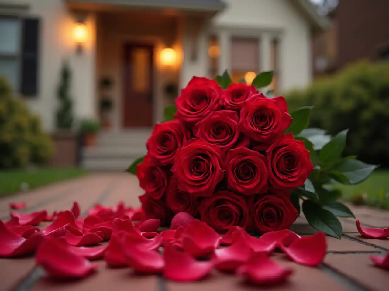 Terbingkai dengan indah (((buket mawar merah yang bersemangat))), kelopak menyebar dengan lembut dari depan (rumah) dalam (foto definisi tinggi yang sangat realistis), menangkap detail yang rumit dan (pencahayaan yang halus dan hangat) membawa suasana romantis dan indah ke dalam adegan (film profesional)