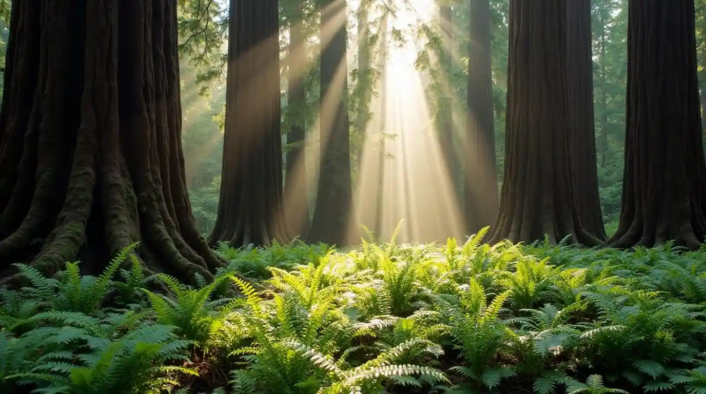 Redwood Forest, di mana sinar matahari disaring melalui kanopi ke karpet dengan lapisan pakis.