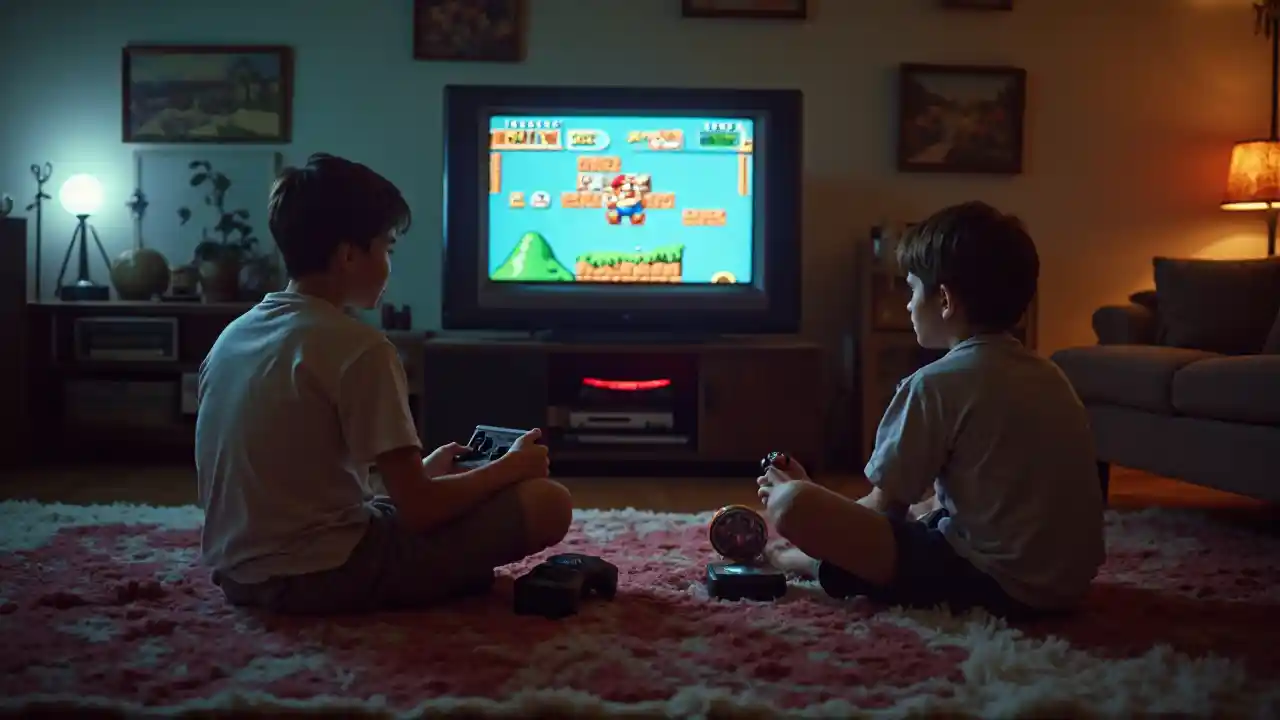 Olympusd450, 3 teman 18 tahun bermain super nintendo di ruang tamu, duduk di karpet menatap permainan super mario di tv retro tahun 1999, silau menyinari tv, nostalgia retro