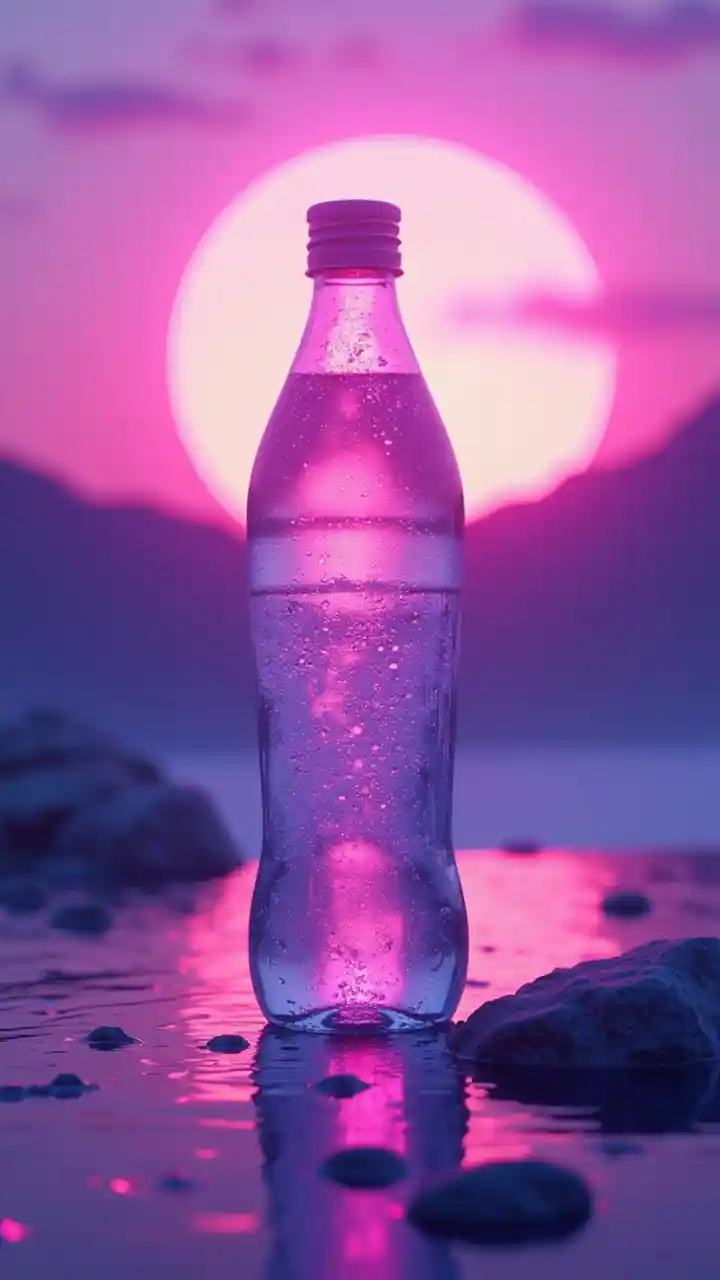 Fotografi Profesional Satu botol air mancur mewah, pemandangan gelombang ganda, lampu neon ungu, sinar matahari, gunung di tengah, dunia fantasi terlihat, warna rentang dinamis tinggi, cahaya tinggi yang kuat, cahaya volume, tidak ada label, jelas, model