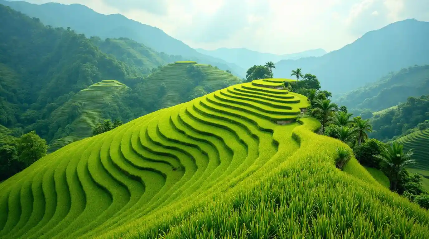 Sawah bertingkat, dicat dengan tangga hijau ke langit.