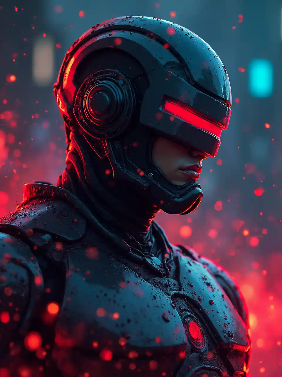 AdalynPoster film Robocop, neon wind, cyberpunk, futuristik, lumpur, hitam, api, ledakan energi, ultra-detail, nyata, ekspresi mendalam, mencoba gaya helm yang lebih dramatis