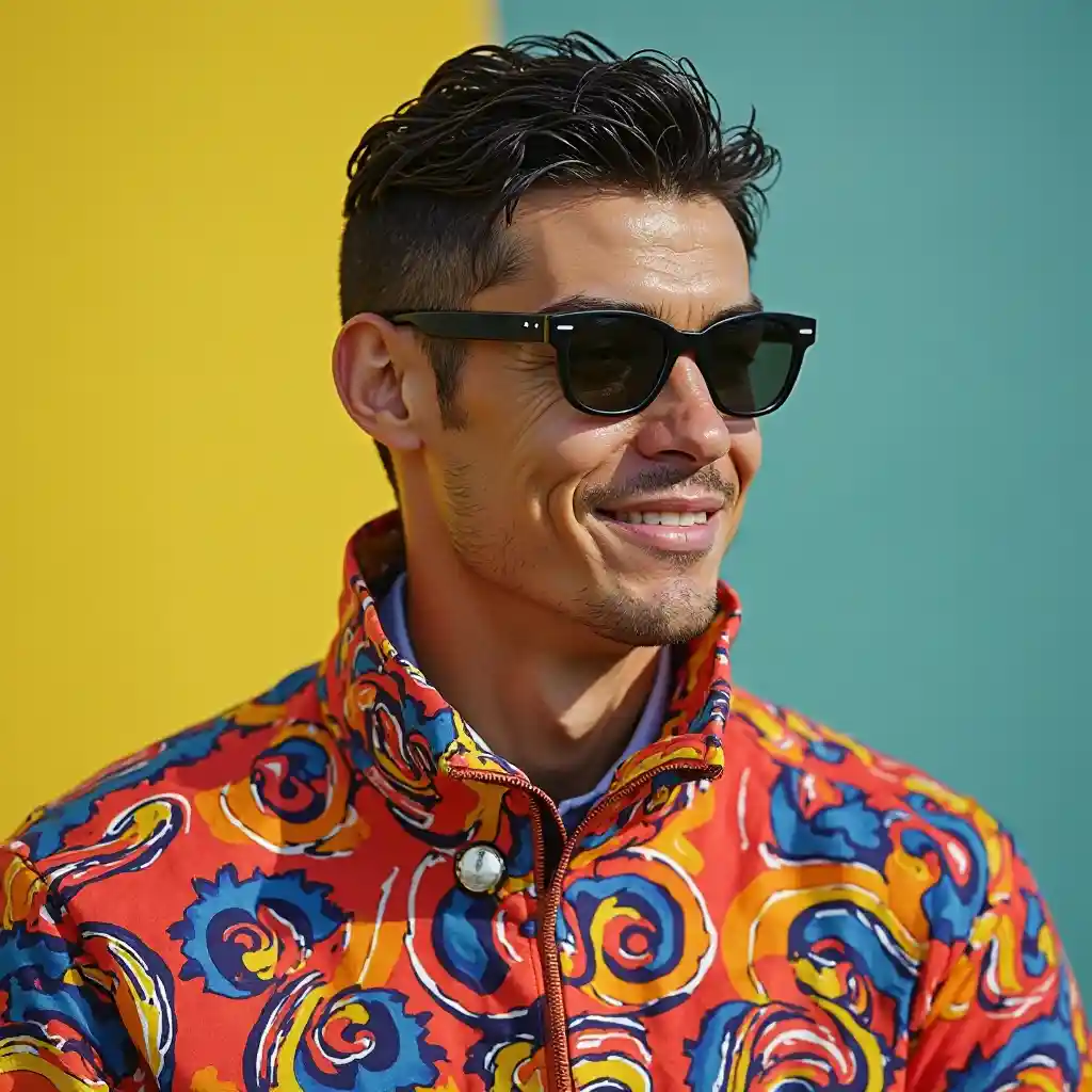 Ronaldo mengenakan jaket bermotif cerah dan kacamata pelancong, warna jenuh yang hidup, warna kontras