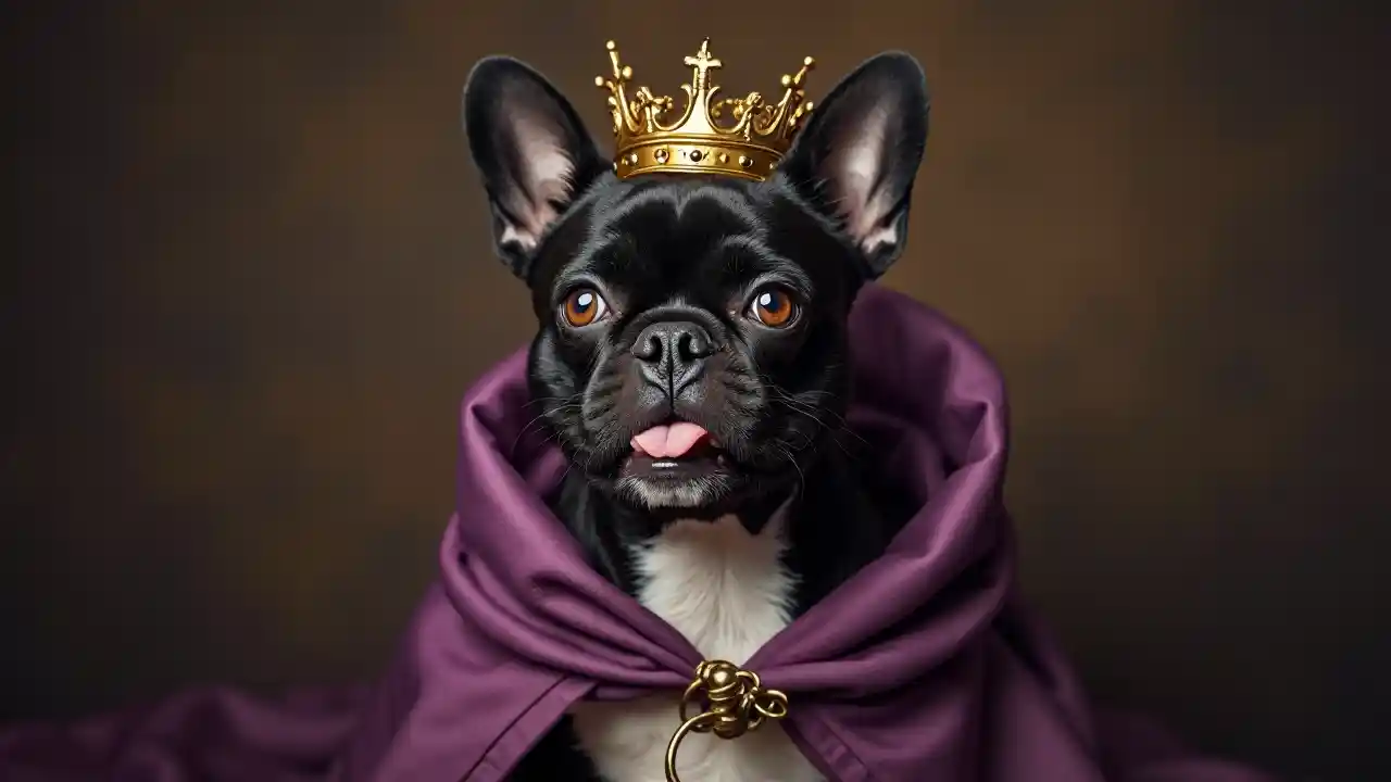 Seekor anjing bulldog Perancis yang tersenyum hitam dengan dada putih dan mata coklat memakai jubah ungu kerajaan dan memakai mahkota yang dilukis sesuai dengan gaya potret Raphael
