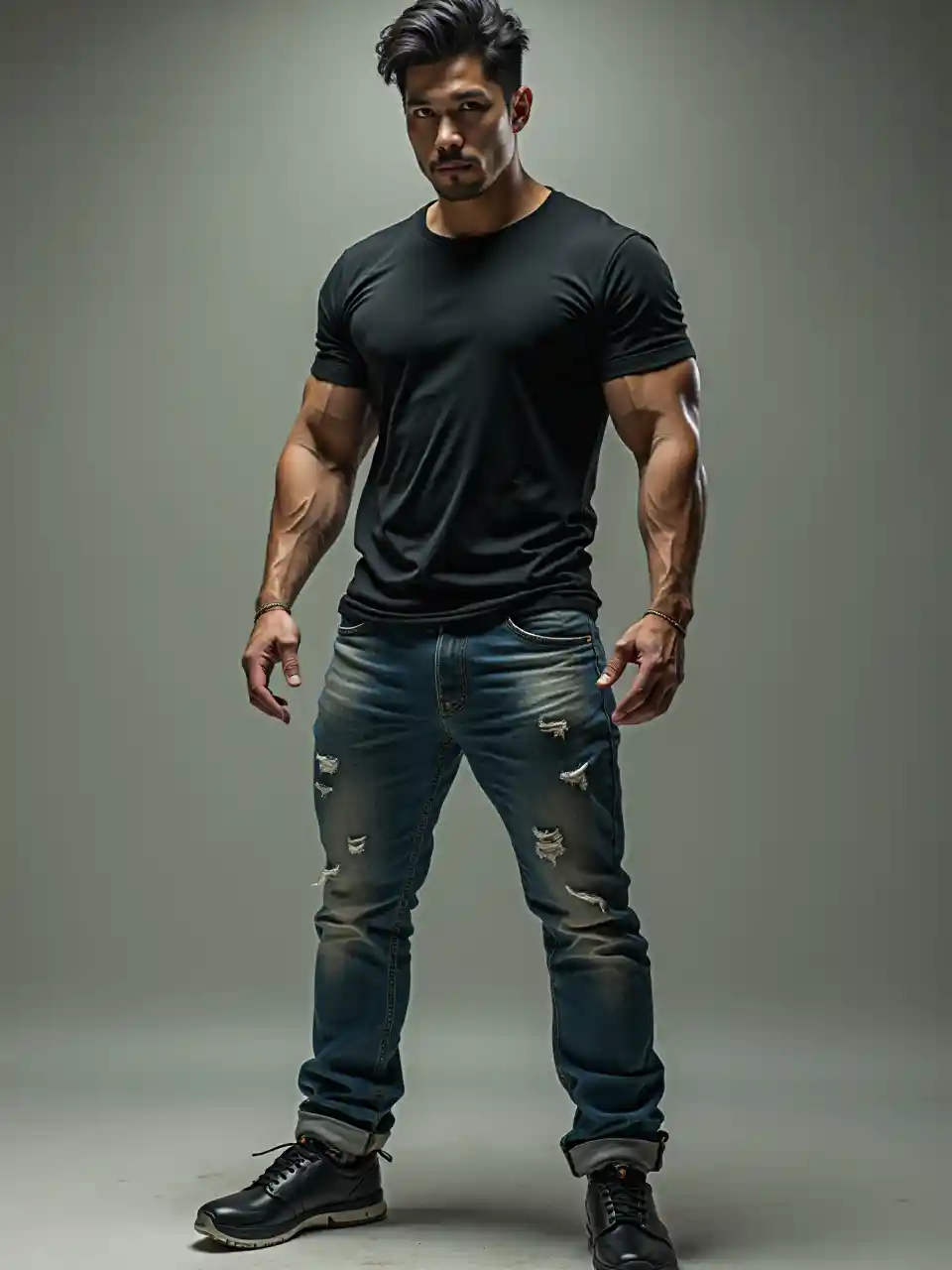 Seorang pria Asia yang kasar dan tampan dengan t-shirt hitam yang pas, celana jeans biru tua, sepatu kets yang modis, dan pinggiran psikopat berdiri dengan percaya diri. Fisiknya memiliki tubuh yang terlalu berotot, dan otot ukiran yang menonjol menyiratkan kekuatan surealis. Penampilannya sedikit terdistorsi, dengan anggota tubuh tambahan yang tampaknya memanjang dari punggungnya, tampak suram, dan detail yang tidak jelas menyatu ke dalam kondisinya. Tatapannya yang kuat menembus fitur resolusi yang sedikit kabur dan lebih rendah. Gambar ditandai dengan kualitas surealis dan fantastis yang menggabungkan elemen realistis dan abstrak.