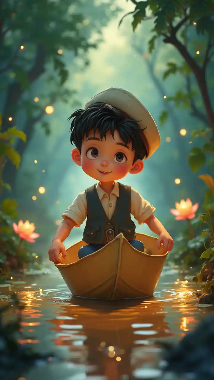 Seorang anak laki-laki kulit putih berusia 7 tahun dengan bintik-bintik mengendarai perahu kertas di sungai yang mengalir, mengenakan topi pelaut dan rompi. Kunang-kunang dan bunga teratai membingkainya, dan dorongan lembutnya memancarkan rasa ingin tahu dan petualangan damai di lingkungan yang fantastis dan alami.