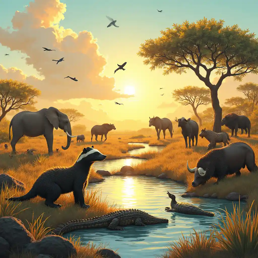 Di padang rumput Afrika yang semarak, hewan liar berkumpul untuk menunjukkan pemandangan yang menarik. Musang madu berdiri menantang di depan, bulunya berkilau di bawah sinar matahari keemasan, sementara seekor buaya dengan malas merangkak di tepi air, berkilau hipnotis di bawah cahaya hangat. Di dekatnya, seekor gajah sedang mengukur lanskap, bentuknya yang besar memberikan bayangan lembut di tanah, dan seekor kerbau Afrika merumput dengan tenang di sebelahnya. Seekor kumbang kotoran menggulung bola kotoran yang berkilauan, memantulkan sinar matahari sore yang cerah. Di antara mereka, seekor unta yang kesepian mengarungi kabut fatamorgana, sementara Wolverine yang lincah tampaknya siap, dengan ekspresi galak yang menyiratkan energi liar. Di latar belakang, orca menerobos genangan air sementara ikan panahan melesat di atas air, siap untuk menyerang. Adegan ditampilkan dalam warna-warna yang hidup dan alami dan pose yang dinamis, meningkatkan rasa hidup dan drama dalam ekosistem yang harmonis ini.