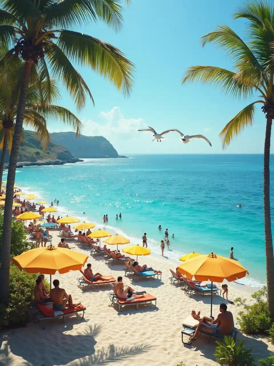 Bayangkan hari cerah yang indah di resor tepi laut di mana air jernih memantulkan cahaya hangat matahari. Payung warna-warni dan tempat tidur berjemur menghiasi area resor untuk menciptakan suasana meriah. Suara pengunjung yang mengobrol, angin laut yang lembut, dan kicauan burung camar yang lembut membuat suasana tenang dan hidup di udara. Adegan itu digambarkan dalam nuansa musim panas yang hidup, di mana lautan bertemu dengan pasir dalam kaleidoskop biru dan putih. Gambar ini menangkap esensi dari liburan tepi laut yang sempurna, di mana sinar matahari, laut, dan pasir menciptakan harmoni yang indah.