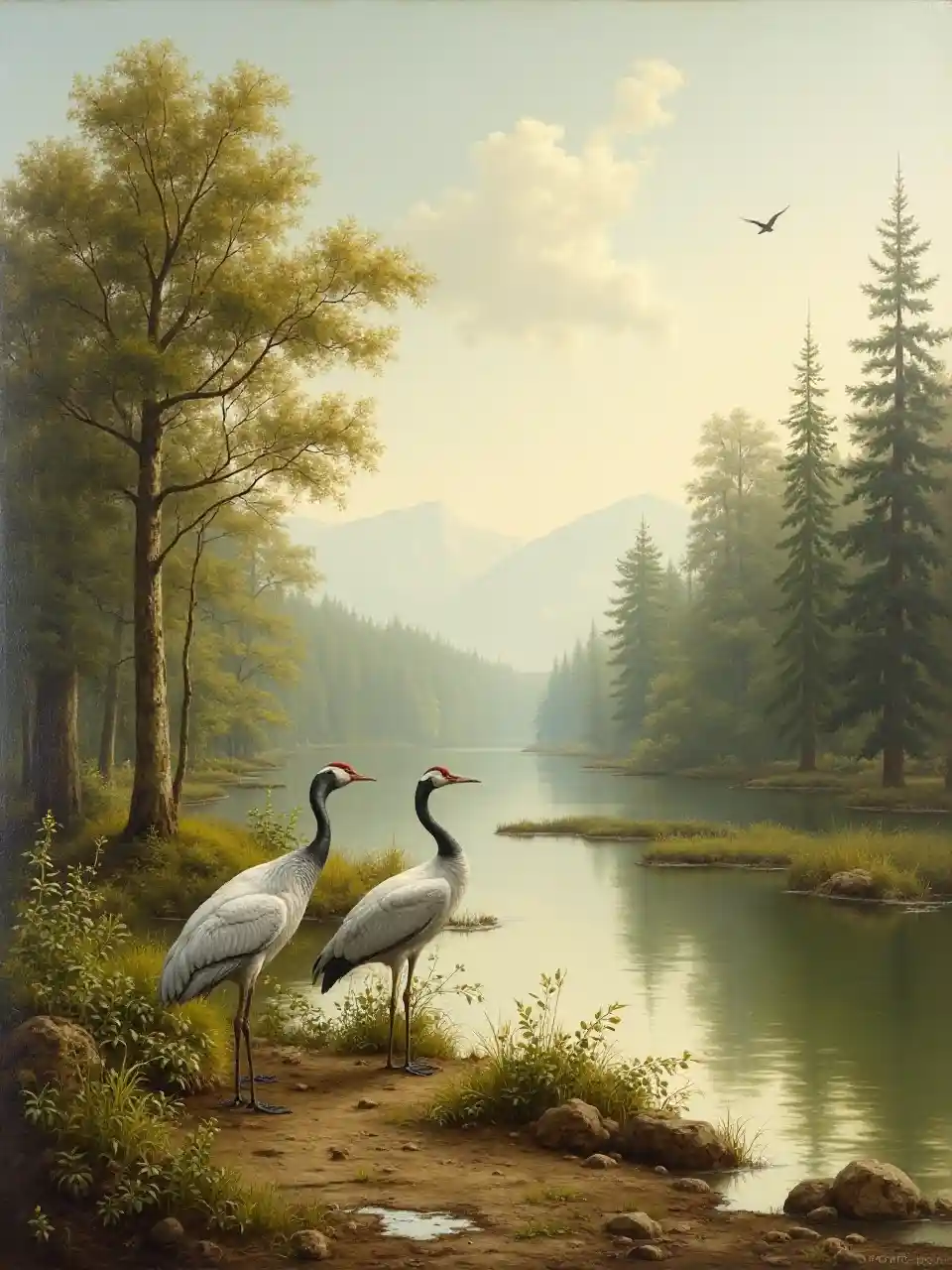 Lanskap terperinci yang indah dengan gaya realis abad ke-19 - lingkungan yang tenang dan alami, dikelilingi oleh tanaman hijau yang subur dan pohon-pohon tinggi, dengan badan air yang tenang. Di latar depan, dua burung bangau yang anggun berdiri di dekat air, dan pantulan mereka terlihat samar di tanah yang basah dan berlumpur. Daerah sekitarnya terdiri dari tekstur tanah, air kolam kecil, dan vegetasi yang tersebar, menambah nuansa yang dalam dan realistis. Tanah di tengah didominasi oleh air reflektif, dengan rumput dan semak-semak menonjol dari permukaannya. Permukaan air tenang, memantulkan langit dan pepohonan, berkontribusi pada suasana damai dan harmonis di tempat kejadian. Di latar belakang, hutan lebat yang terdiri dari pohon gugur yang selalu hijau membentang ke cakrawala, secara bertahap memasuki bidang pandang yang kabur dan atmosfer. Langit lembut dan ringan, dipenuhi dengan awan halus dan cahaya halus, menyiratkan apakah itu pagi atau sore hari. Saya melihat seekor burung melayang di langit, menambahkan rasa gerakan ke adegan yang awalnya diam dan kontemplatif. Seniman dengan terampil menangkap keindahan alam lanskap, menggunakan palet yang kaya dan halus, warna hijau yang hangat, coklat seperti tanah liat, nada emas yang lembut. Komposisinya seimbang, dengan crane di latar depan sebagai titik fokus, sementara pohon dan langit membentuk seluruh gambar.